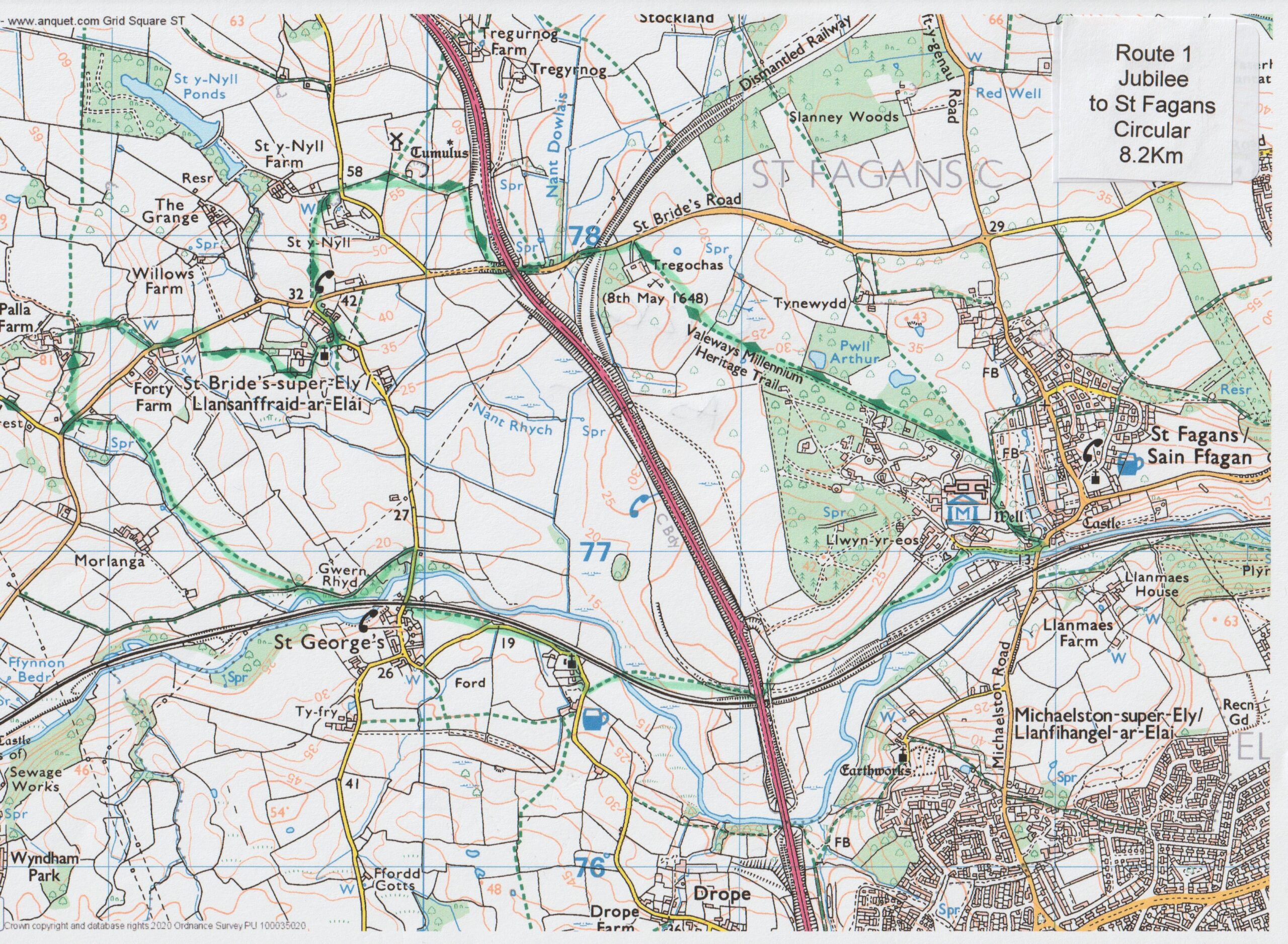 The route goes from the centre of Cowbridge to Welsh St Donats. Through the woodland to pick up the Valeways heritage trail to Peterston super Ely, walking alongside the river, then to Jubilee.